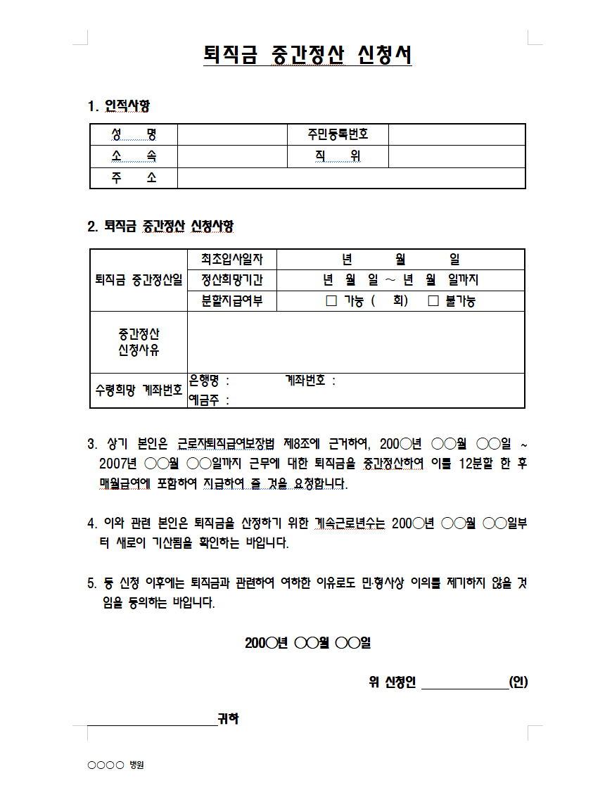 1. 퇴직금 중간정산 신청서 양식 및 다운로드